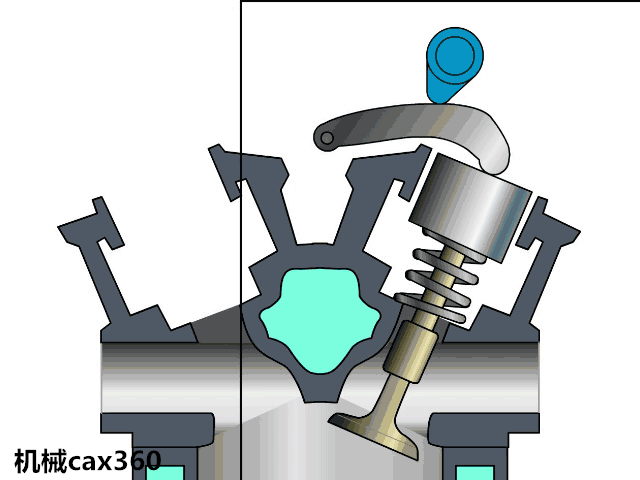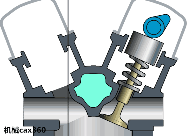 ▲凸轮直压式气门。它通常见于DOHC引擎,此式汽门弹簧座上有一圆形套筒,凸轮则直接置于套筒上,所以当凸轮尖端与套筒接触时,会透过套筒把汽门往下压,使汽门开启;而摇臂式汽门通常使用在SOHC引擎上,因为SOHC引擎缸头内只有一支凸轮轴,却要驱动多个汽门,所以会以摇臂方式,由一个凸轮带动两个汽门。摇臂是利用杠杆原理,当凸轮尖端将摇臂一端挺起时,另一端会向下将汽门压下以使汽门开启。