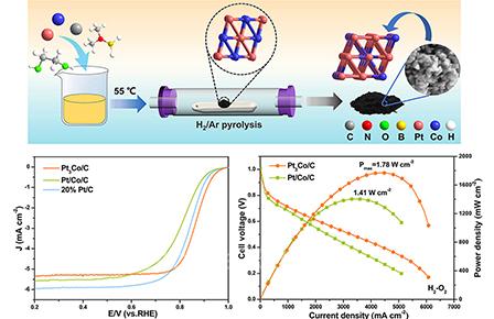 因此,北京化工大学的向中华教授等研究人员使用二甲胺硼烷(DMAB)作为还原剂(在化学反应中向另一种物质提供电子的物质),合成了一种铂-钴-碳前体(可通过进一步反应得到目标化合物的化合物,在这里是铂-钴合金)。将该前驱体在氢气和氩气环境中加热到高温,以生成一种纳米级颗粒形式的铂钴合金,其中每三个铂原子对应一个钴原子。