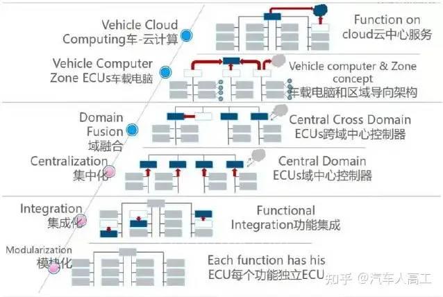 博世给出的电子电气架构路线图分为六个阶段,已成行业共识:分布式阶段(包括模块化、集成化)、域集中式(包括集中化、域融合)、中央集中式(包括车载电脑、车云计算)。