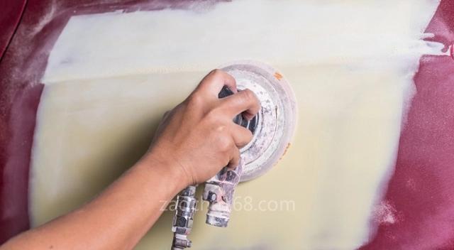 打磨:用P280砂纸彻底研磨车身需要涂中间涂料的旧涂料。