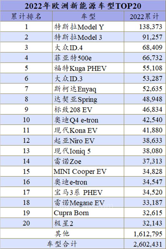 不过,从具体的品牌和车型来看,2022年欧洲新能源乘用车市场还是发生了不小的变化,其中最明显的就是特斯拉首次成为欧洲新能源品牌销量冠军。