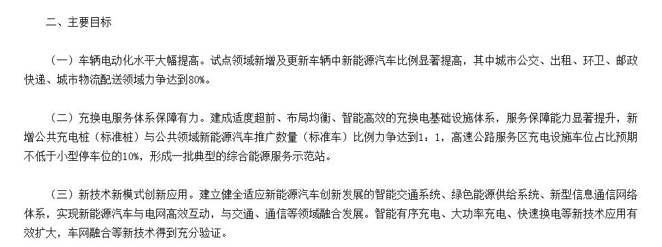《试点通知》在先行先试的地方有一些量化的考核指标。比如,试点领域新增及更新车辆中新能源汽车比例显著提高,其中城市公交、出租、环卫、邮政快递、城市物流配送领域力争达到80%;新增车桩比力争达到1:1,高速公路服务区充电设施车位占比预期不低于小型停车位的10%,形成一批典型的综合能源服务示范站。