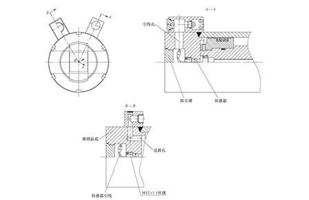 来密封,用M32×1.5mm丝堵来压紧传感器,以防传感器工作时在液体的压力下发生轴向蹿动。传感器的引线从引线孔穿出,后面用带密封防尘堵与外面隔开,确保引线孔处不进入粉尘。传感器密封圈与防尘堵一起形成一个密闭空间,确保传感器引线不被损伤和污染。