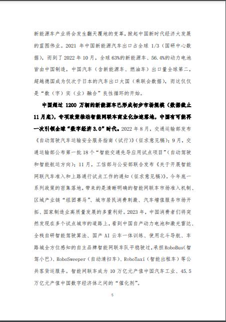 “数字经济3.0”作为智能经济时代,与前两个时期大为不同,体现在生产力工具、经济创新主体、人机分工三个方面。AR眼镜逐步取代手机,云算力取代电脑,自动驾驶汽车改造交通运输业,机器人重构超级工厂生产线,生产力硬件更新换代,颠覆了原有互联网为主导的商业创新模式,将生产力工具的主导权还给“新硬件”制造企业,并通过AI技术实现新硬件的全面智能化,包括智能认知、智能决策、智能执行,并用AI颠覆传统互联网软件,例如生成式AI(GenerativeAI)自动生成文字、语音、视频、程序代码,AI传感器(空间感知)、机器视觉基模型、XR 构建元宇宙应用业态(数字人、空间交互应用、虚实融合生产线等),以“连接”为功能的搜索、电商、游戏、社交必然面临挑战,被各行各业的“机器智能体”所解构、重建、驱动、自优化,而智能网联车则是第一波大规模生产力变革浪潮,对人类生活方方面面产生深远影响。