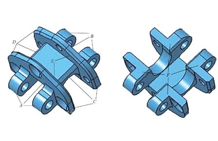 图1为接头零件结构,材料为30CrMnSiA高强度合金钢,热处理后抗拉强度图片=(1175±100)MPa,多用于飞机、导弹上的主要受力零部件。从结构上看,接头零件的前、后、左、右、上和下各面(以A ~F 表示)均有一定的加工内容,需要多工位反复加工。另外,该零件尺寸精度等级最高为IT8级。